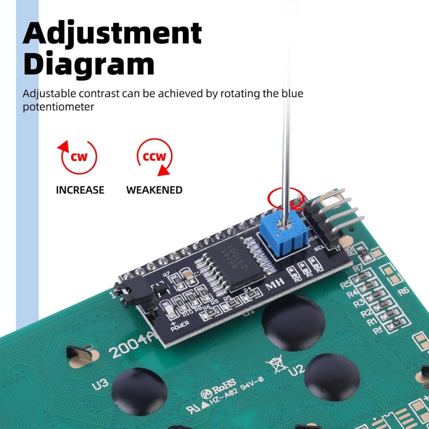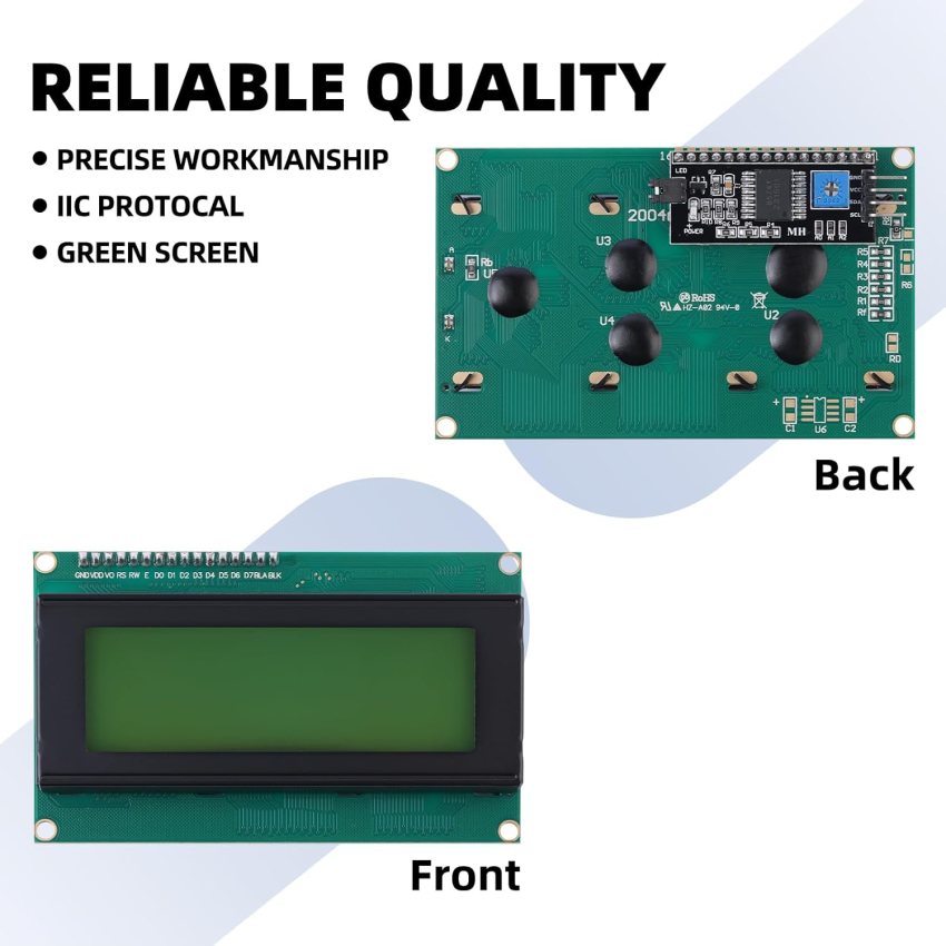 <br>This is I2C interface 20x4 LCD display module, a new high-quality 4 line 20 character LCD module with on-board contrast control adjustment, backlight and I2C communication interface.The real significance advantages of this I2C Serial LCD module will simplify the circuit connection, save some I/O pins on Arduino board, simplified firmware development with widely available Arduino library.<br>Superior Quality. We adopt Lead-free processes and immersion gold PCBs. The lead-free process gives safe of use and assurance. As a chemical process, immersion gold ensures a flat surface of the gold overlay pad, which can longer product life. Working voltage: 5V, Module size:98x60x9mm, Viewing area:77x24mm. ST7066U controller.<br>The LCD panel has a Built-in independent potentiometer, backlight can be adjusted through the back potentiometer. You can control the readability of the displayed content.<br>Compatibility: It can be used with all current development boards, such as Arduino, Raspberry pi, Tinkerboard, Nano pi, Banana pi, stm32 and so on.<br>2004 green LCD screen are widely used in various applications, including digital clocks, temperature and humidity displays, electronic voting machines, industrial automation, robotics, embedded projects, your own DIY circuits and more.