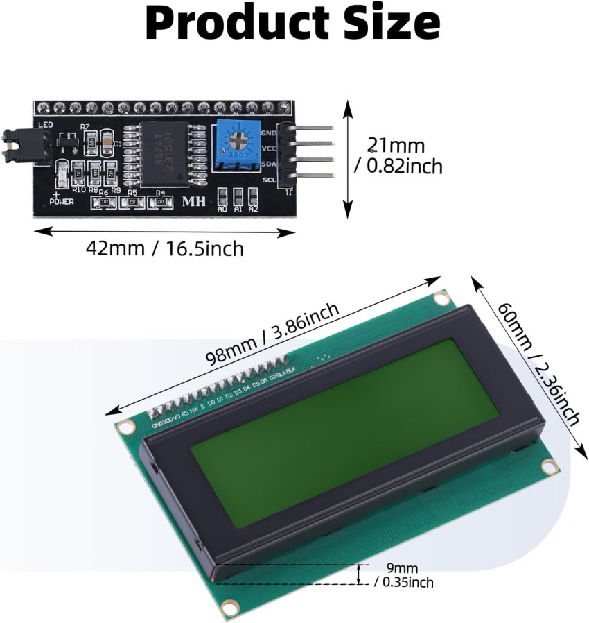 Display: 20 Characters * 4 Lines Working voltage: 5V Pin definition: VCC,GND,SDA,SCL Module size: 98x60x9mm Viewing area: 77x24mm