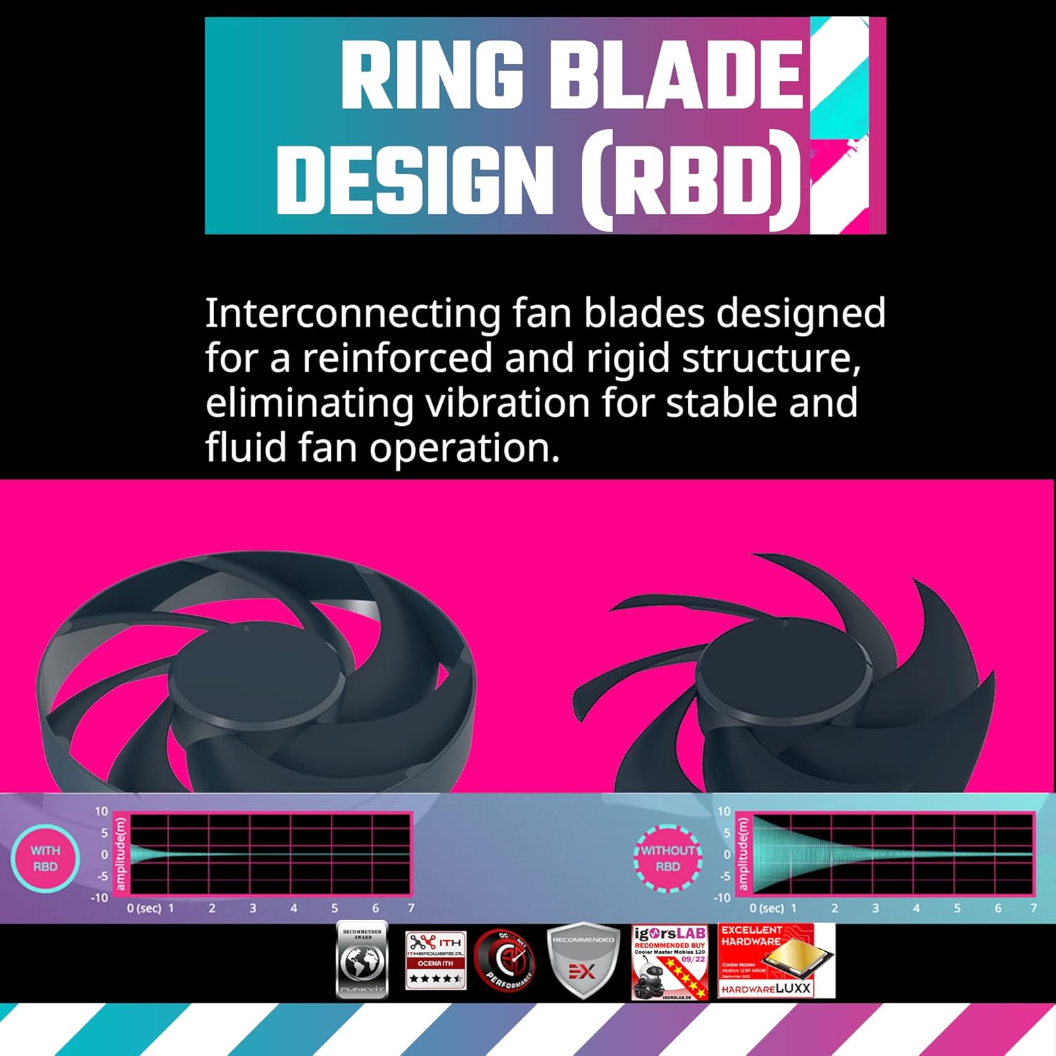 Ring Blade Design (RBD): Interconnecting fan blades designed for a reinforced and rigid structure, eliminating vibration for stable and fluid fan operation.