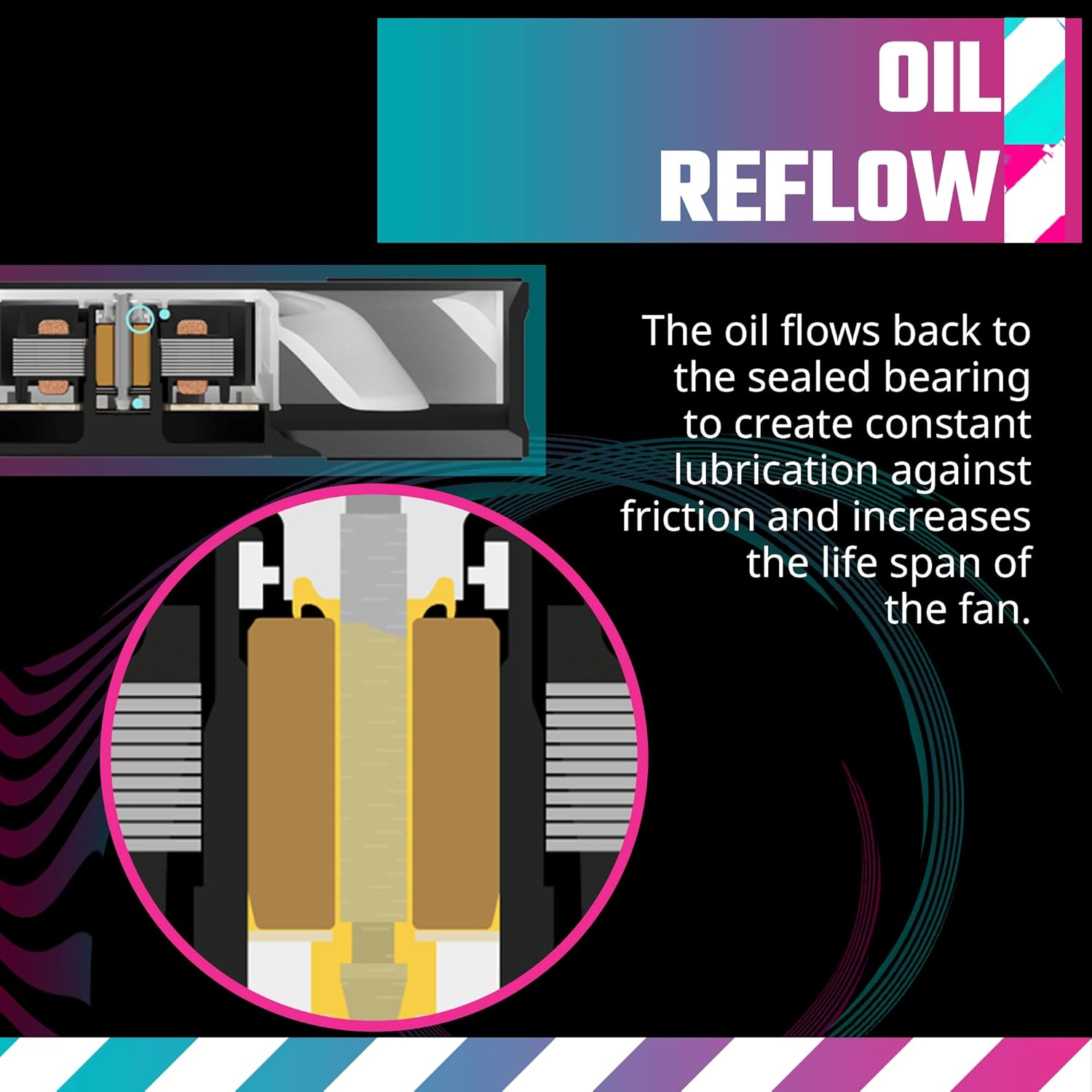 Oil Reflow: The oil flows back to the sealed bearing to create constant lubrication against friction and increases the life span of the fan.