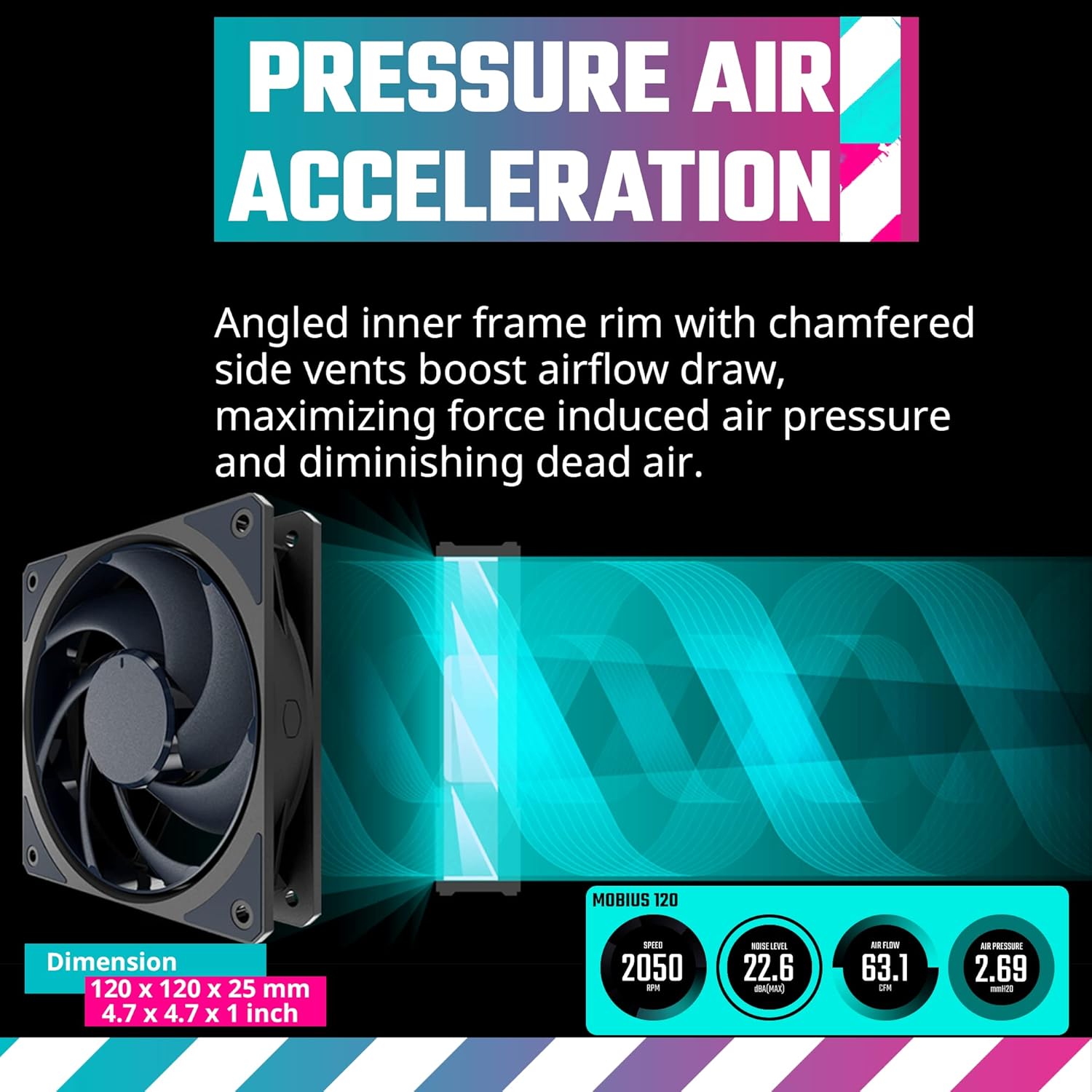 Cooler Master’s Mobius 120 is our new series of performance fans. With our enhanced Ring Blade Design, the Mobius Series optimizes both performance and acoustics, catering to a dynamic range of applications from case, liquid or air, to overclocking and intense gaming.