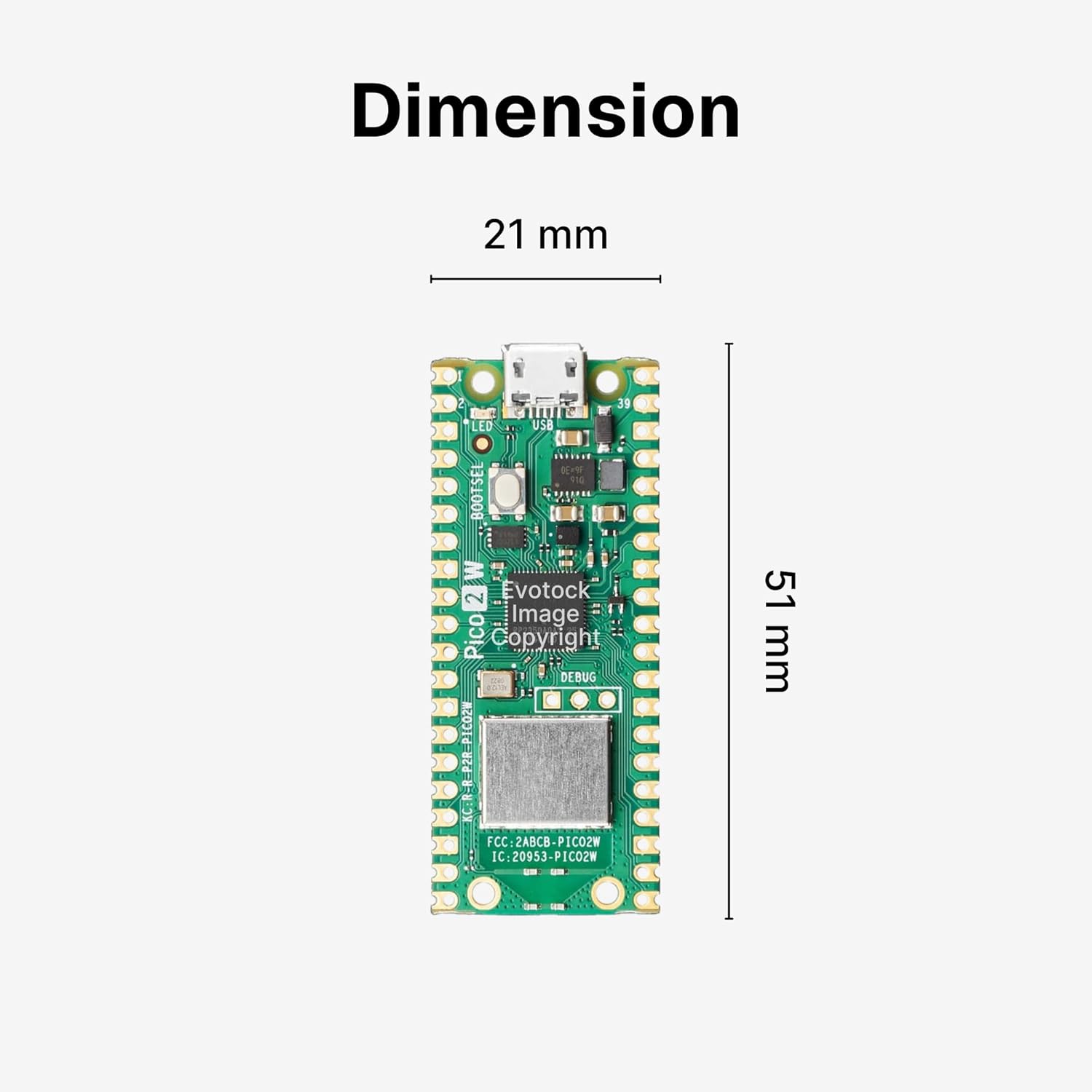 The Pi Pico 2W is an upgraded microcontroller board powered by the new RP2350, offering superior performance and advanced features. With dual Arm Cortex-M33 and RISC-V Hazard3 cores, the board runs at a faster clock speed and includes expanded memory—512KB SRAM and 4MB onboard flash. Integrated wireless connectivity supports 2.4GHz WiFi (802.11n) and Bluetooth, enabling seamless IoT integration. Designed for enthusiasts and professionals, the Pico 2W offers 26 GPIO pins, advanced peripherals like 12 PIO state machines, and high-frequency output capabilities with HSTX. Enhanced security features such as Arm TrustZone, SHA-256, and a hardware TRNG ensure a secure development environment. Backward compatibility with the earlier Pico series makes it a seamless upgrade for existing projects, while detailed documentation and multi-language programming support simplify development. Whether for IoT, robotics, or embedded applications, the Pi Pico 2W delivers cutting-edge technology in a compact, efficient design.