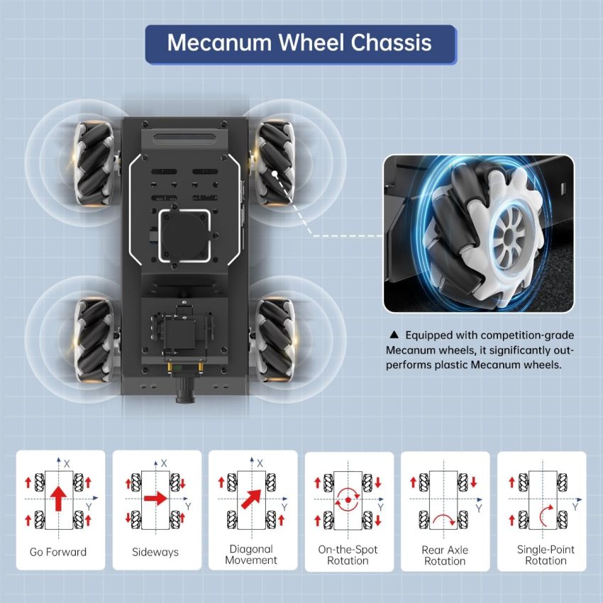 <br>Robot Car for Raspberry Pi 5 & ROS2. MentorPi M1 is powered by Raspberry Pi 5, compatible with ROS2, and programmed in Python, making it an ideal platform for AI robot development.<br>360° Omnidirectional Mobility with Mecanum-Wheel Chassis. MentorPi M1 smart robot car is built on a mecanum-wheel chassis, enabling 360° omnidirectional movement. This design provides greater flexibility in various applications and better adaptability to diverse terrains.<br>High-Performance Hardware. Equipped with closed-loop encoder motors, TOF lidar, 360°visual range AI camera, high-torque servos, and other advanced components to ensure optimal performance and efficiency.<br>Advanced AI Capabilities. Supports SLAM mapping, path planning, multi-robot coordination, vision recognition, target tracking, obstacle avoidance, and more, covering a wide range of AI applications.<br>Autonomous Driving with Deep Learning. Utilizes YOLOv5 model training to enable road sign and traffic light recognition, along with other autonomous driving features, helping users explore and develop autonomous driving technologies.