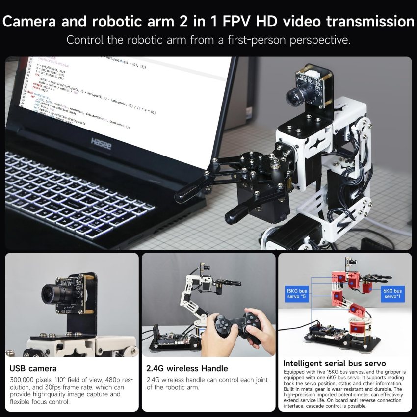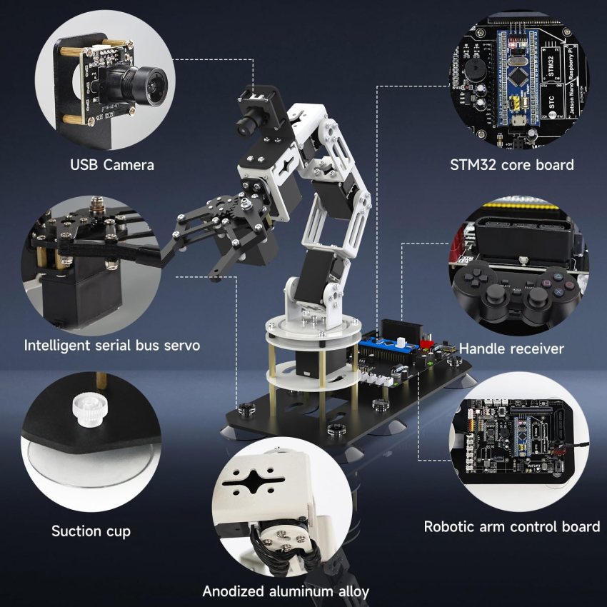 <br>Desktop robot arm controlled by a virtual machine: Dofbot-SE robot arm uses a virtual machine as the main controller and does not rely on the expensive RaspberryPi jetson nano. It also implements complex grasping tasks such as custom model training, garbage classification, and gesture recognition. take action (VM Software Not Support MAC) Yahboom only provide Windows version.<br>6DOF intelligent serial bus servo robot arm: The robot body of the robot arm contains 6 bus servos that support readback of position and status information. The servo has built-in metal gears, high-precision potentiometers, anti-reverse connection interfaces, and can be cascaded. control. As a key accessory of the robotic arm, the powerful servo system can ensure accurate movement of the robotic arm and increase its service life, allowing it to easily grab objects weighing 200g-500g.<br>Diversity of control methods: The robot kit can be controlled through the standard wireless handle, mobile APP and computer mouse in the kit. Multiple operation methods can be used for various projects and learning, bringing more creative possibilities and fun.<br>Creative function development: the camera and the robotic arm are combined into one. The camera is responsible for AI recognition work, and the robotic arm is responsible for command output operations. It realizes inverse kinematics algorithm by controlling each joint, color recognition, tracking and grabbing, gestures and faces. Recognition tracking, MediaPipe machine learning, action group copying, chess playing, garbage classification and a series of complex actions<br>High-quality structure and high-quality after-sales service team: The robotic arm uses high-quality aluminum alloy and industrial-grade bearings, which can be used and learned endlessly. Yahboom develops Python source code for Dofbot SE, with 151 courses, from basic to advanced learning, and technical support to protect you.<br>Complete package, no need to prepare expensive development board master